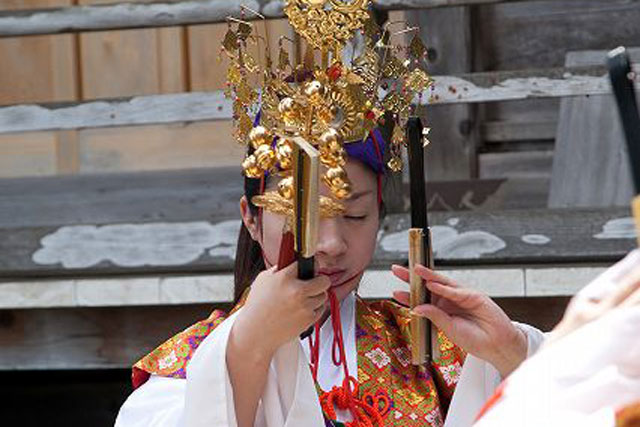 古来、神が降臨する際の「依り代」として、樹木や、岩、そして人の手が加えられた柱や鉾などが神座として祀られてきましたが、人間自身が神座となり、神の降臨を請うた舞が独立して、巫女の神楽として成立したと考えられています。