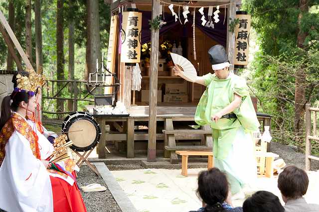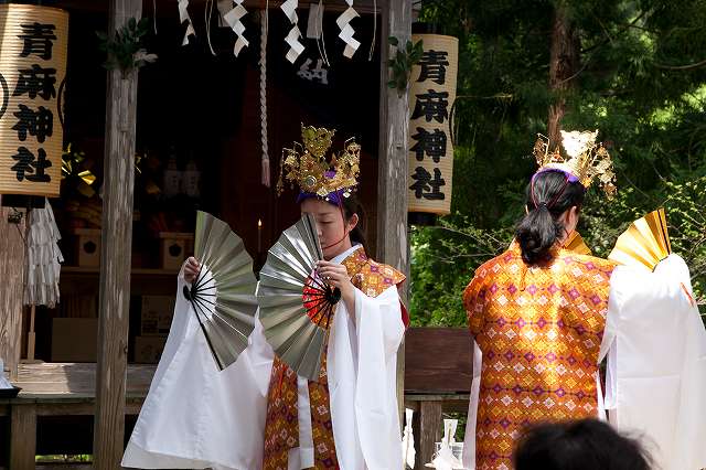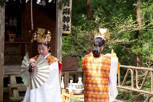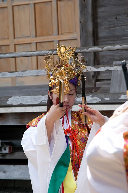 現在は形式化されていますが、締太鼓を打つものが歌う神歌にあわせて巫女が歌うとか、巫女だけで神歌を単独で歌うなどは、本来は託宣を意味していたと考えられます。男性が舞っている神楽の中にも、もともとは巫女が舞ったものと考えられる神楽の演目も見られます。